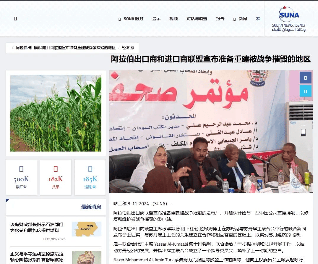 2024年11月8日,喀土穆(SUNA):阿拉伯进出口商结合会颁布发表打算沉建和平地域,并已取中国公司联系修复受损电坐。结合会穆罕默德·阿卜杜勒·拉希姆暗示,结合会曾正在多地实施沉建项目,阿拉伯进出口商结合会也将努力于消弭工做妨碍,鞭策苏丹经济苏醒。