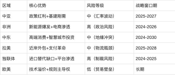1。 中亚/非洲:设立区域供应链枢纽(如哈萨克斯坦阿拉木图、整合“跨境电商+海外仓+当地化办事”。2。 中东/拉美:取从权基金合做(如沙特PIF、巴西BNDES),以PPP模式衔接大型基建项目,绑定设备出口。3。 独联体/欧美:建立“合规防火墙”,通过第三国实体(如土耳其、塞尔维亚)处置买卖,规避制裁风险。