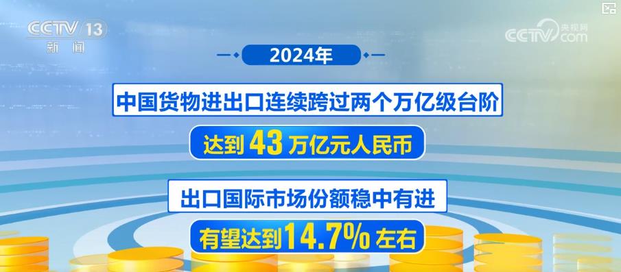 2024年,中国货色进出口持续跨过两个万亿级台阶,达到43万亿元人平易近币。出口国际市场份额稳中有进,无望达到14。7%摆布。有进出话柄绩的企业近70万家,同时,“立异”成为中国外贸的明显底色,通过智能化、数字化、绿色化的持续转型升级,中国产物的立异力获得了全球消费者的青睐。“鼠标一点,买卖全球”,跨境电商为全球消费者创制了更为便当的购物体验,