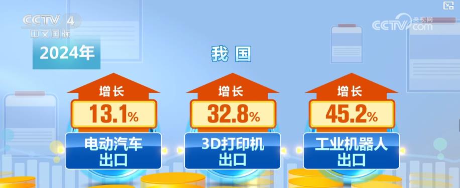 我国外贸出口布局持续优化,产物“新”意更脚,更多高科技属性的新产物加快出海。2024年,我国电动汽车、3D打印机、工业机械人出口别离实现了13。1%、32。8%、45。2%的增加。